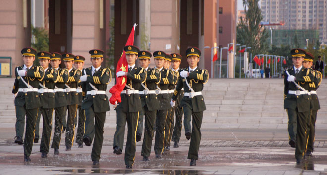 六點五十分,升旗儀式正式開始。國旗班護旗隊以整齊劃一的步伐走向升旗臺,伴隨著軍樂團奏響雄壯的國歌聲,激情在同學心中蔓延,同學們莊嚴的向國旗行注目禮,表達對偉大祖國的熱愛和祝愿。