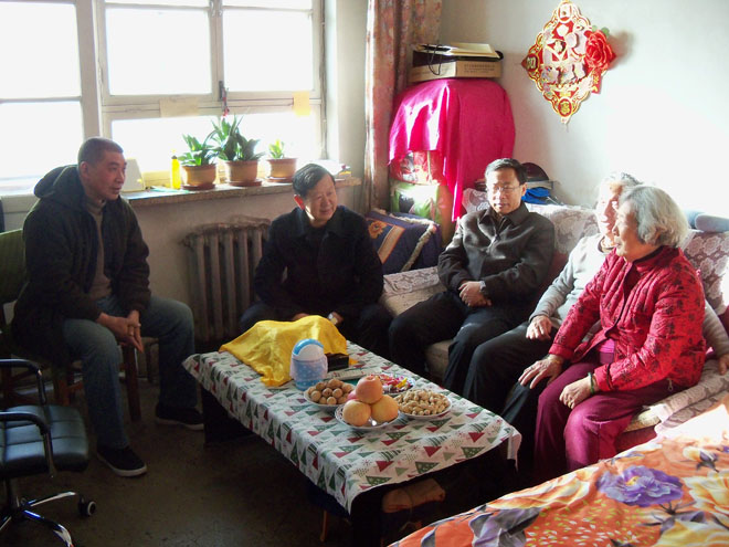 學(xué)院院長(zhǎng)柴金義(左二),黨委副書記、紀(jì)委書記白托婭(左一)慰問(wèn)離休干部李成柏(左三)同志 |
