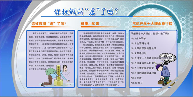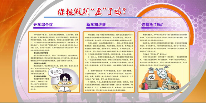 針對(duì)部分學(xué)生的“開學(xué)綜合癥”問題,學(xué)工處(團(tuán)委)通過宣傳展板,引導(dǎo)學(xué)生積極調(diào)整學(xué)習(xí)時(shí)間,樹立學(xué)習(xí)目標(biāo),促使學(xué)生盡快進(jìn)入學(xué)習(xí)狀態(tài)。