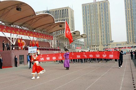 黨委副書記、紀(jì)委書記白托婭代表學(xué)院黨政領(lǐng)導(dǎo)致開幕詞。她說(shuō),一年一度的田徑運(yùn)動(dòng)會(huì)是學(xué)院貫徹“立德樹人”教育思想,全面落實(shí)素質(zhì)教育,響應(yīng)團(tuán)中央“走下網(wǎng)絡(luò)、走出宿舍、走向操場(chǎng)”倡議的重要載體,是對(duì)全院群眾性體育工作成果和師生員工運(yùn)動(dòng)水平的一次檢閱,也是對(duì)廣大師生員工競(jìng)爭(zhēng)意識(shí)、團(tuán)隊(duì)精神、頑強(qiáng)意志的一次考驗(yàn),更是全院師生員工精神風(fēng)貌的一次全面展示,已經(jīng)成為校園生活的重要組成部分。高等學(xué)校作為國(guó)家高層次人才培養(yǎng)的重要基地,同學(xué)們的體質(zhì)與健康事關(guān)國(guó)家和民族的未來(lái)。她號(hào)召大家,要以此次運(yùn)動(dòng)會(huì)為契機(jī),繼續(xù)廣泛開展“陽(yáng)光體育”,積極倡導(dǎo)“三走”,多種方式加強(qiáng)校園體育文化建設(shè),積極營(yíng)造人人關(guān)心、人人參與體育活動(dòng)的氛圍,我們堅(jiān)信,在學(xué)校黨委和學(xué)院黨委的堅(jiān)強(qiáng)領(lǐng)導(dǎo)下,我院全體師生員工將以更加健康的體魄,更加昂揚(yáng)的姿態(tài),更加飽滿的熱情投入到學(xué)院各項(xiàng)事業(yè)的建設(shè)中來(lái)!